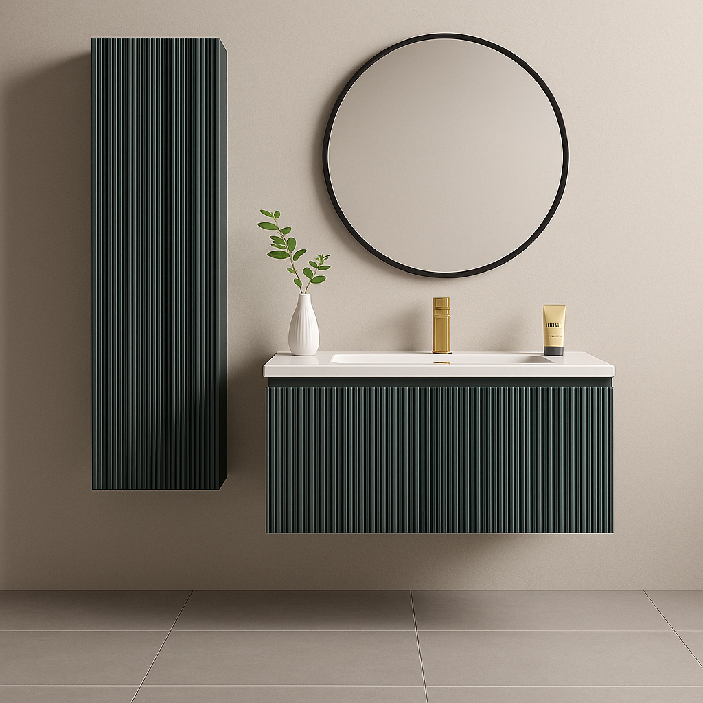The Keenware Windsor 800 Vanity Suite Is At The Pinnacle Of Current On Trend Bathroom Style. Its Fluted Design & Smoky Olive Finish Will Be Standout Centre Piece For any Bathroom.