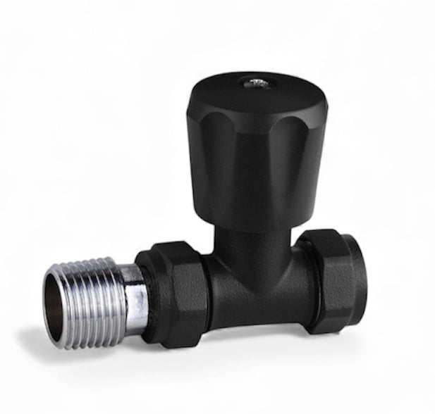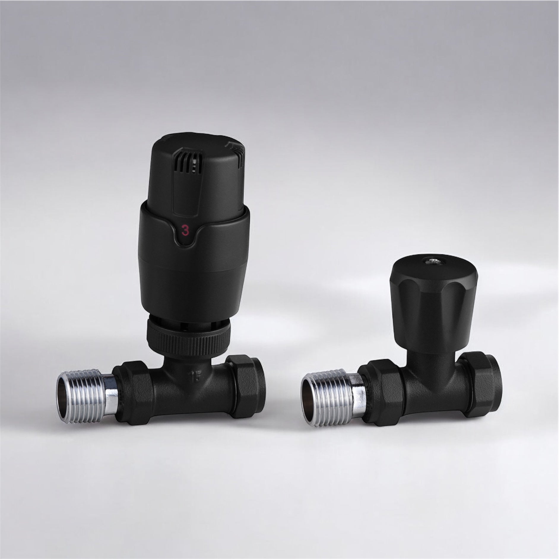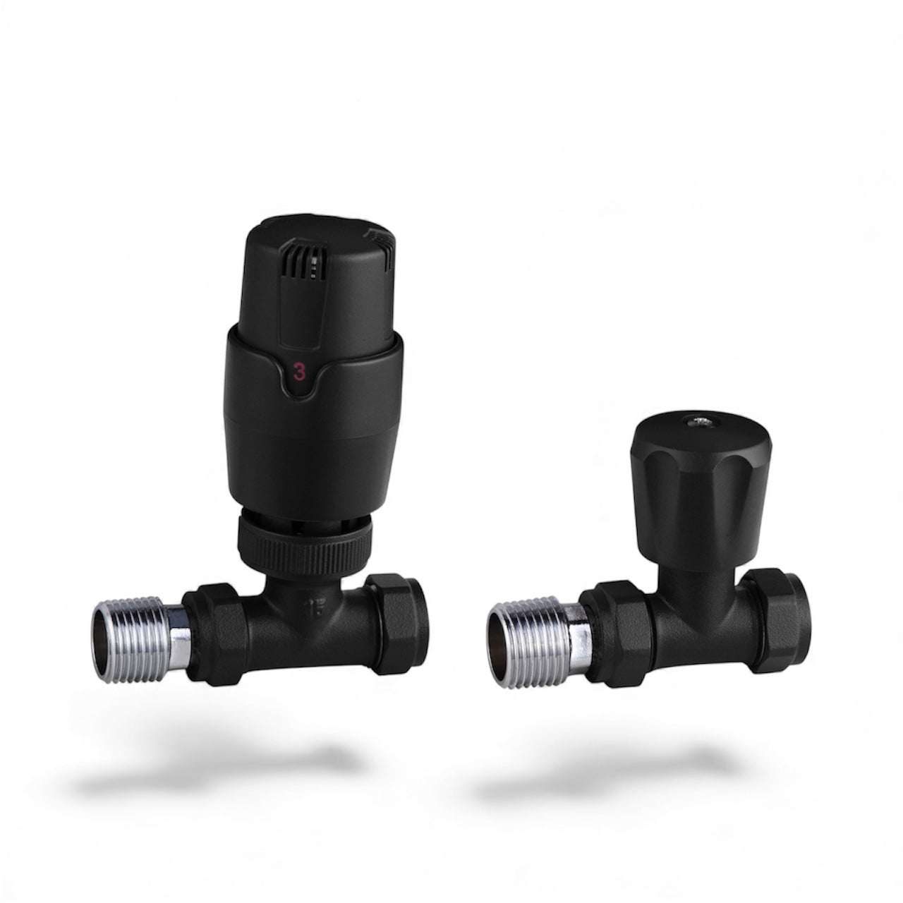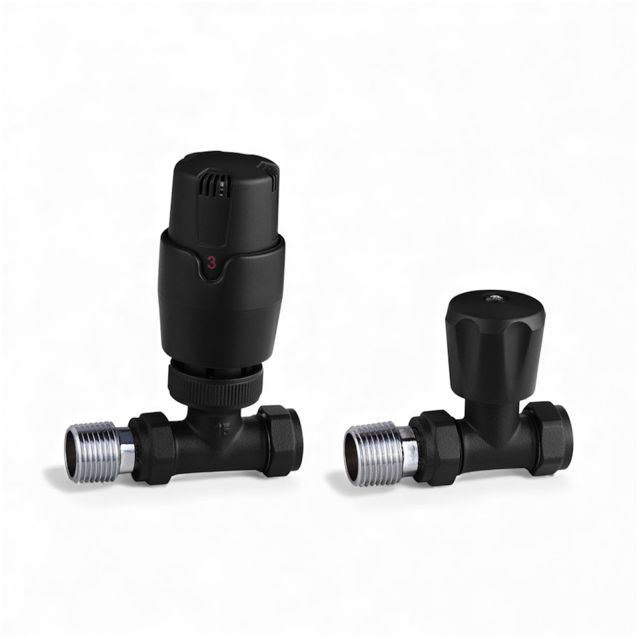 The Keenware KRA-201 Lunar Thermostatic Straight Valves Are Ideal For Both Towel Rails & Radiators, The Black Gives A Great Contemporary Finish.